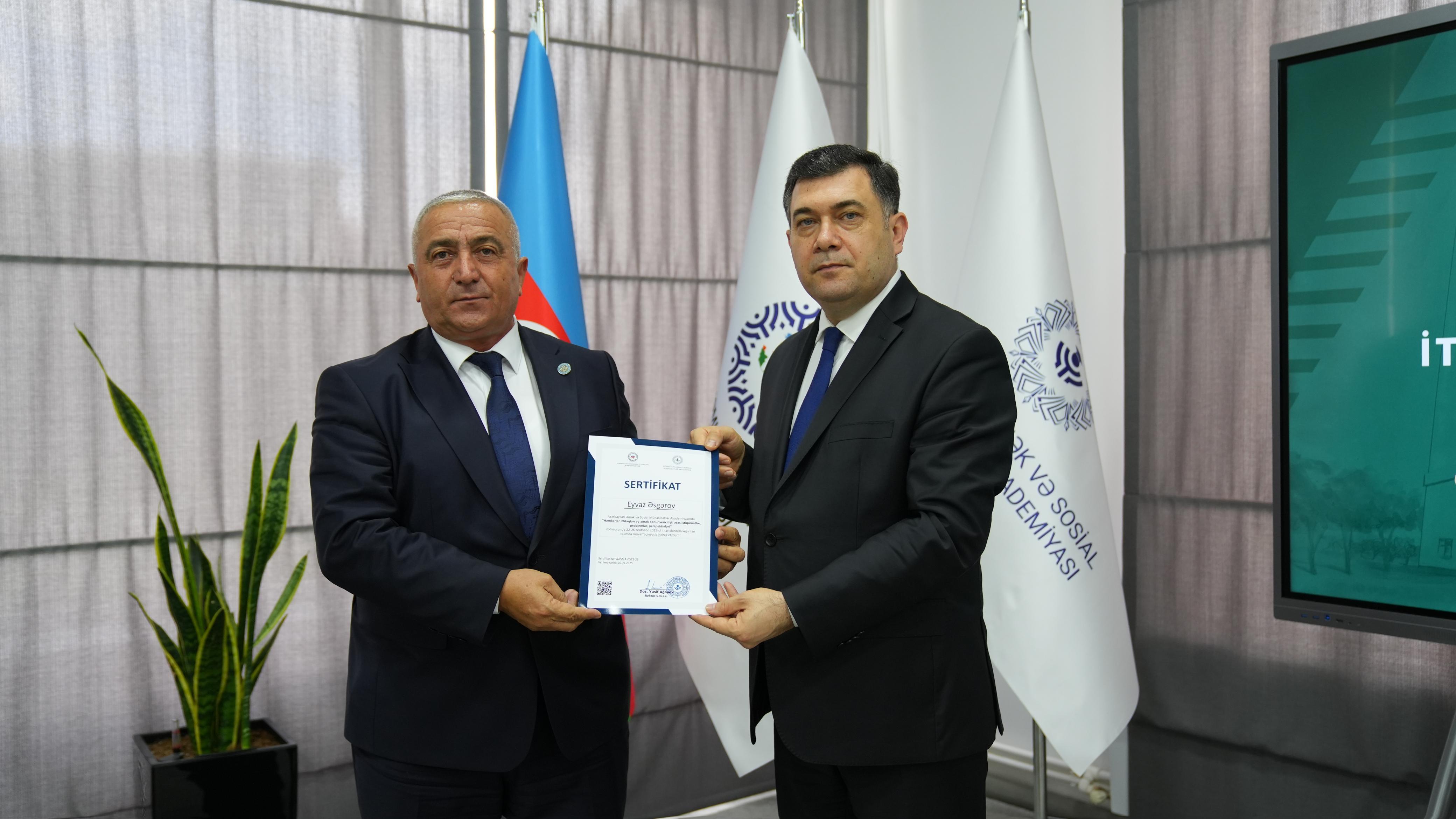 Naxçıvan Muxtar Respublikası Həmkarlar İttifaqları Şurasının əməkdaşları Azərbaycan Əmək və Sosial Münasibətlər Akademiyasında “Həmkarlar ittifaqları və əmək qanunvericiliyi: əsas istiqamətlər, problemlər, perspektivləri” mövzusunda 5 günlük ixtisasartırma kursunda iştirak ediblər. Təlim müddətində iştirakçılara əmək hüquqları, kollektiv müqavilələrin bağlanması, işçi-işəgötürən münasibətləri, təşkilatda əməyin mühafizəsinin idarə edilməsinin əsasları, işgüzar ünsiyyətdə ritorika həmçinin sosial tərəfdaşlıq mexanizmləri ilə bağlı geniş məlumatlar təqdim edilib. Mövcud problemlər və onların həlli yolları barədə interaktiv müzakirələr aparılıb. Kursda fəal iştirak edən əməkdaşlara Akademiyanın rəhbərliyi tərəfindən sertifikatlar təqdim olunub.