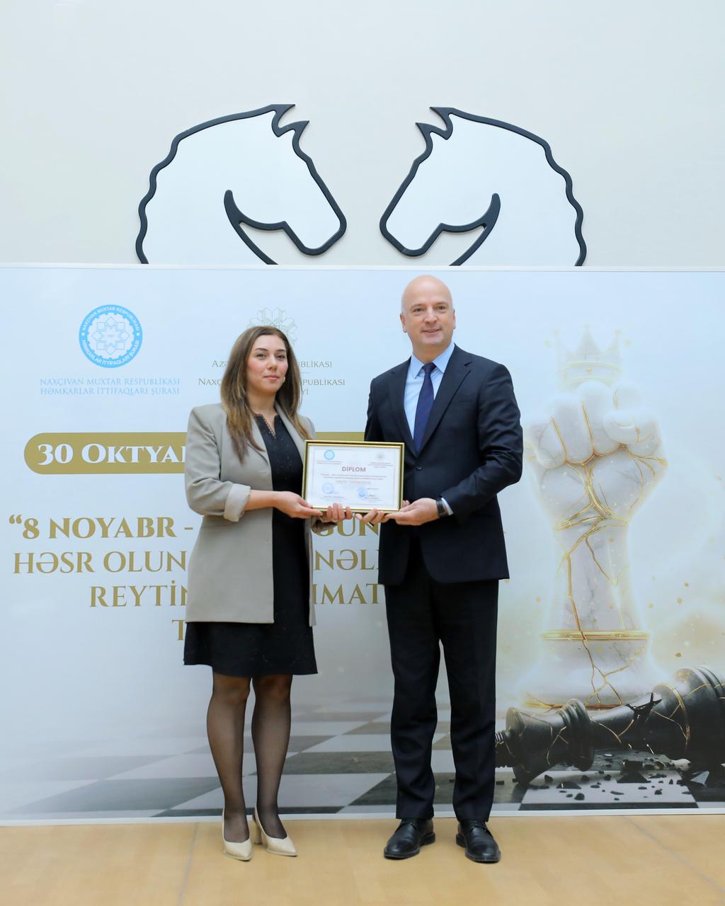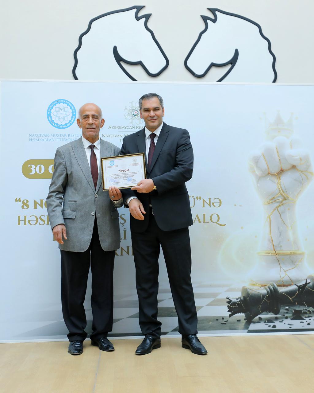Naxçıvan Muxtar Respublikası Həmkarlar İttifaqları Şurası və Naxçıvan Muxtar Respublikası Təhsil Nazirliyinin birgə təşkilatçılığı, Azərbaycan Şahmat Federasiyasının dəstəyi ilə Naxçıvan Şahmat Mərkəzində keçirilən, 8 Noyabr – Zəfər Gününə həsr olunmuş beynəlxalq reytinqli şahmat turniri başa çatıb. Noyabrın 7-də şahmatçıların mükafatlandırma mərasimi keçirilib. Turnirin baş hakimi Tural Zeynalov məlumat verib ki, Zəfər Gününün önəmini əks etdirən və gənclərin intellektual inkişafına töhfə vermək məqsədilə təşkil olunan, müxtəlif yaş kateqoriyalarında mübarizə aparan şahmatçıların bilik və bacarıqlarını nümayiş etdirdikləri turnirdə, ümumilikdə, 88 şahmatçı iştirak edib. Onlardan 52-si beynəlxalq reytinqli, 36-sı isə reytinqsiz oyunçulardır. 9 turdan ibarət İsveçrə sistemi ilə təşkil edilmiş yarışda 11 qadın iştirakçı, həmçinin 6-16 yaş aralığında 62 gənc, 2 Türkiyə vətəndaşı və 6 veteran şahmatçı mübarizə aparıb. Sonra Naxçıvan Muxtar Respublikası Ali Məclisi sədrinin birinci müavini, Azərbaycan Şahmat Federasiyasının vitse-prezidenti Bəxtiyar Məmmədov, Naxçıvan Muxtar Respublikasının təhsil naziri Elxan Nəcəfov və Azərbaycan Həmkarlar İttifaqları Konfederasiyasının sədr müavini, Naxçıvan Muxtar Respublikası Həmkarlar İttifaqları Şurasının sədri Qəzənfər Abdullayev qalib şahmatçılara və turnirin hakimlərinə mükafatlarını təqdim ediblər. Turnirin yekun nəticələrinə əsasən, ümumi qaliblər sırasında I yerə Pərviz Qasımov, II yerə Toğrul Həsənzadə, III yerə isə Urfan Sevdimalıyev layiq görülüb. Yarışın ən gənc iştirakçıları Dəniz Abbasbəyli və Alparslan Dünyamalıyev olub. Veteranlar arasında isə Ələddin Bayramov qalib adını qazanıb. Sonda xatirə fotosu çəkdirilib.