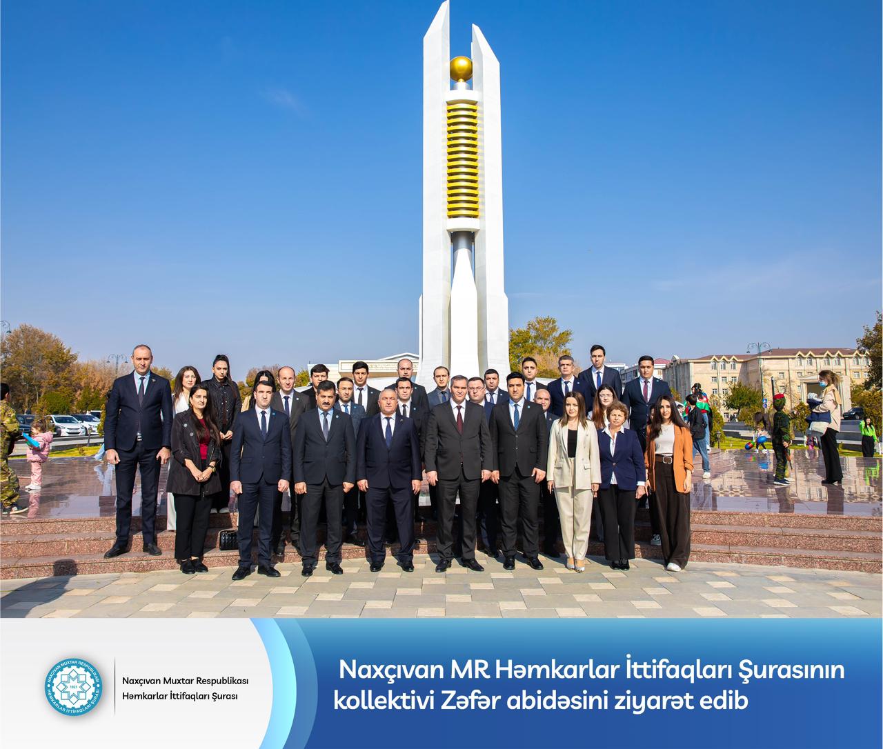 8 noyabr – Zəfər Günü münasibətilə Naxçıvan Muxtar Respublikası Həmkarlar İttifaqları Şurasının kollektivi Naxçıvan şəhərində tarixi Qələbəmizi simvolizə edən Zəfər Abidəsini ziyarət edib. Abidənin önünə gül dəstələri qoyularaq, Vətən uğrunda canlarını fəda edən şəhidlərimizin əziz xatirəsi ehtiramla yad olunub. Sonda Zəfər Abidəsi önündə xatirə şəkli çəkdirilib.